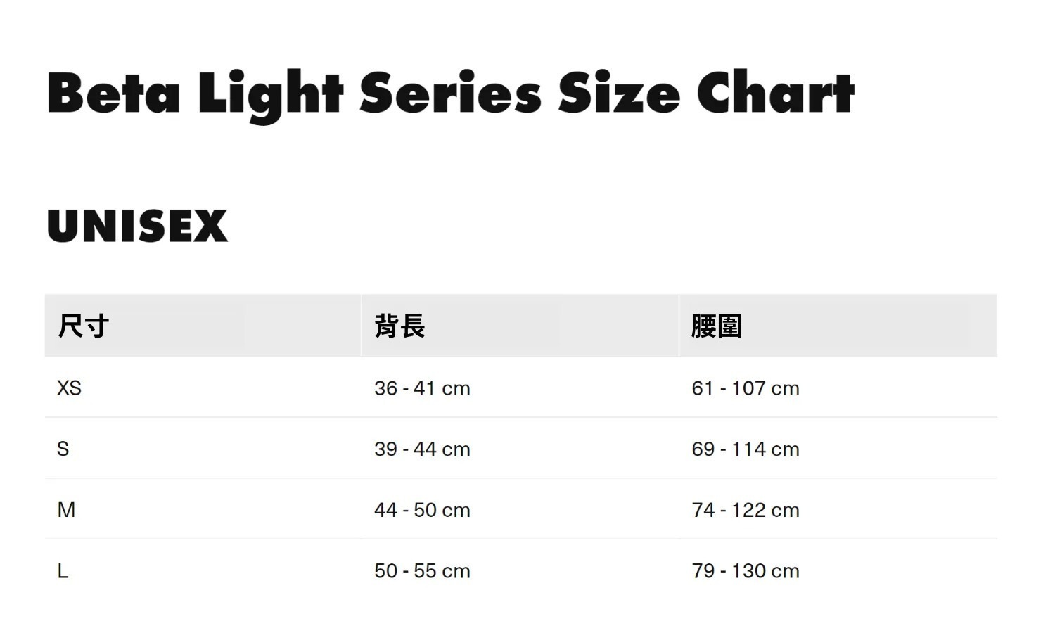 與 Challenge Sailcloth 合作,其布料極度耐磨且輕量,適合少天數的登山背包 - 主體採用 Challenge Sailcloth 的 ECOPAK ™ Ultra 200,底部則採用 Ultra 400,輕量、抗撕裂且極具耐磨 - 肩背帶採用透氣布料設計,設有 1 個拉鍊與 2 個彈性網眼口袋,可放置糧食與軟水壺 - 肩背帶上設有 4 個彈性胸前扣帶,可做拆卸或調整上下位置 - 背板採用菱形網眼布,提供更舒適且透氣的背負系統 - 捲收式開口設計及包內部車縫線做貼條處理,具高防潑水能力 - 可拆卸泡棉背板及腰帶設計,可依需求拆卸以減輕背包重量 - 前側設有大容量彈性網袋、左右兩側各設有抗撕裂鬆緊開口袋 - 內部設有 1 網袋夾層及上方開口,可放置吸管水袋 - 側邊與底部共設有 4 個可調可拆卸的尼龍壓縮帶,根據背負量調整背包,節省空間並提高移動性 ( 底部可收納睡墊 ) - 可以搭配 Beta Light Satellite Bag 扣在背包前側上方處,提供額外的存放空間 建議最大承重:18 kg |
