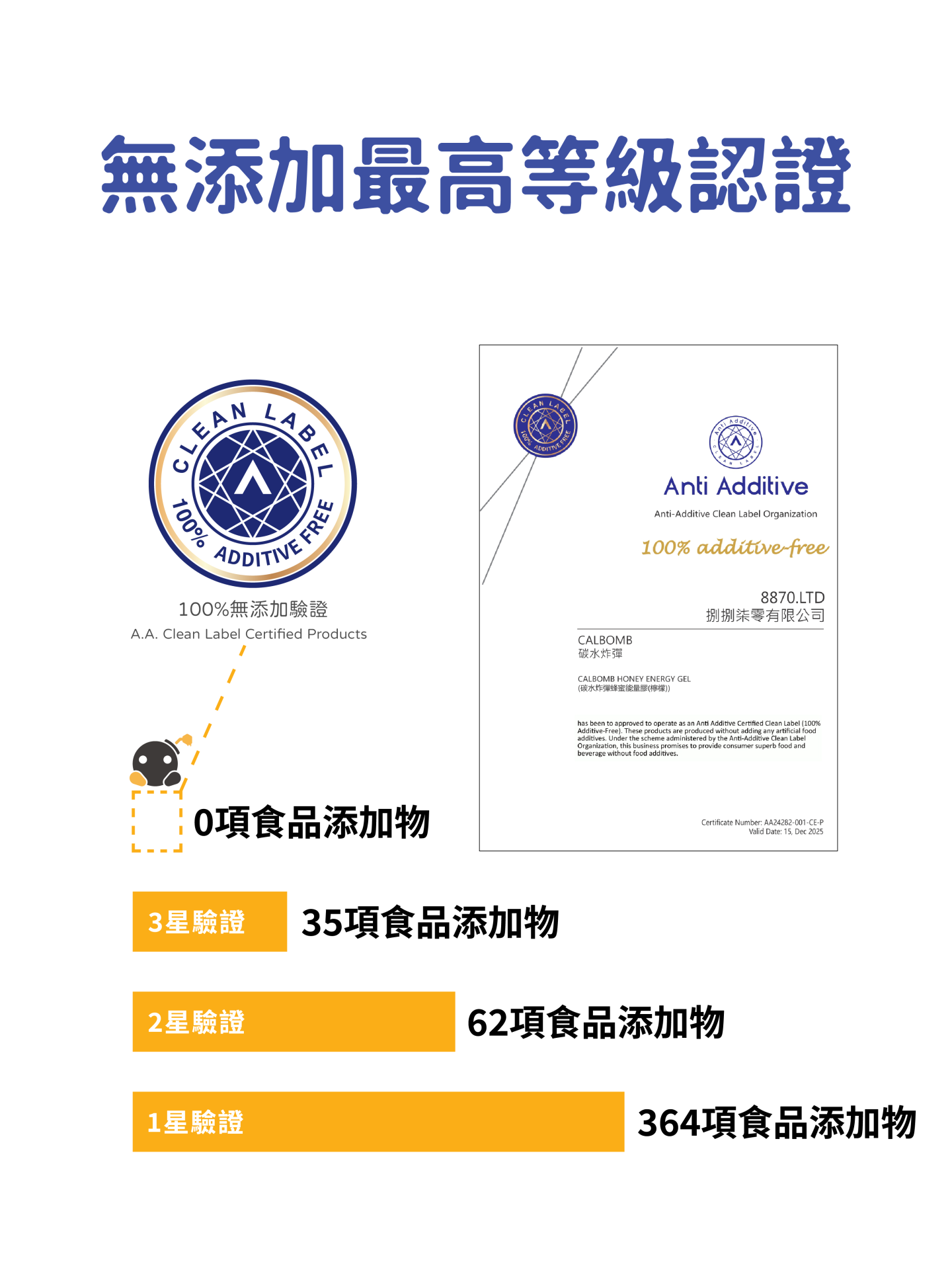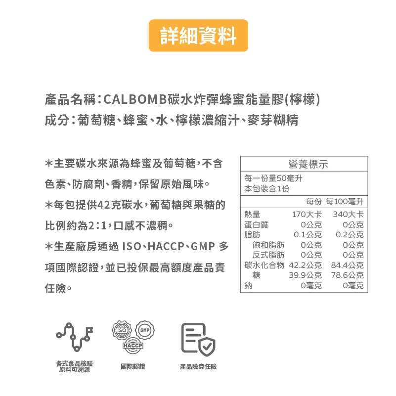 蜂蜜能量膠:葡萄糖、蜂蜜、水、檸檬濃縮汁、麥芽糊精 黑糖能量膠:黑糖、水、香檸原汁、麥芽糊精、檸檬濃縮汁、檸檬酸鈉、葡萄糖 |