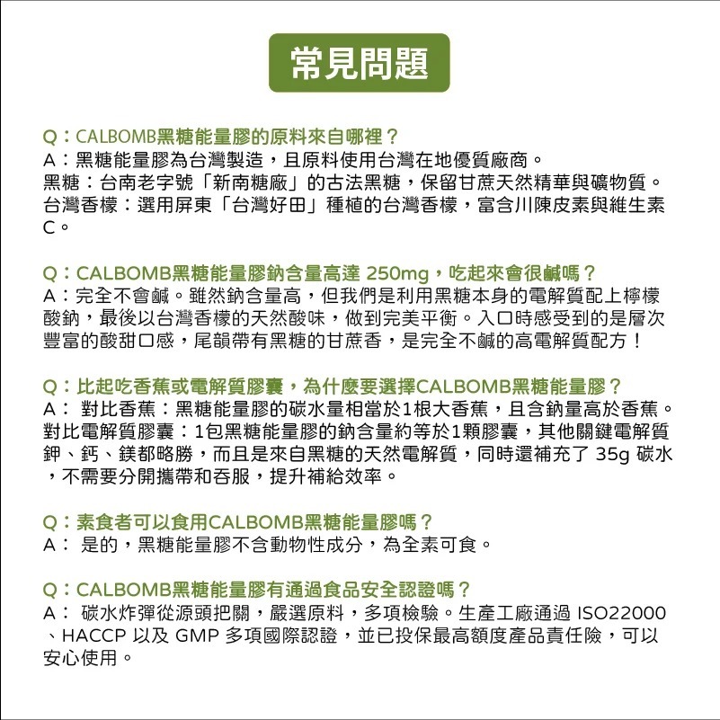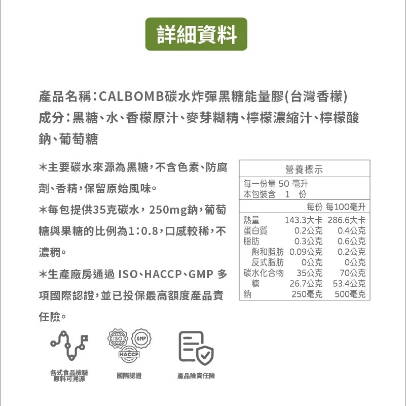 .黑糖能量膠:嚴選原料本土黑糖及台灣香檬,每包含35克碳水