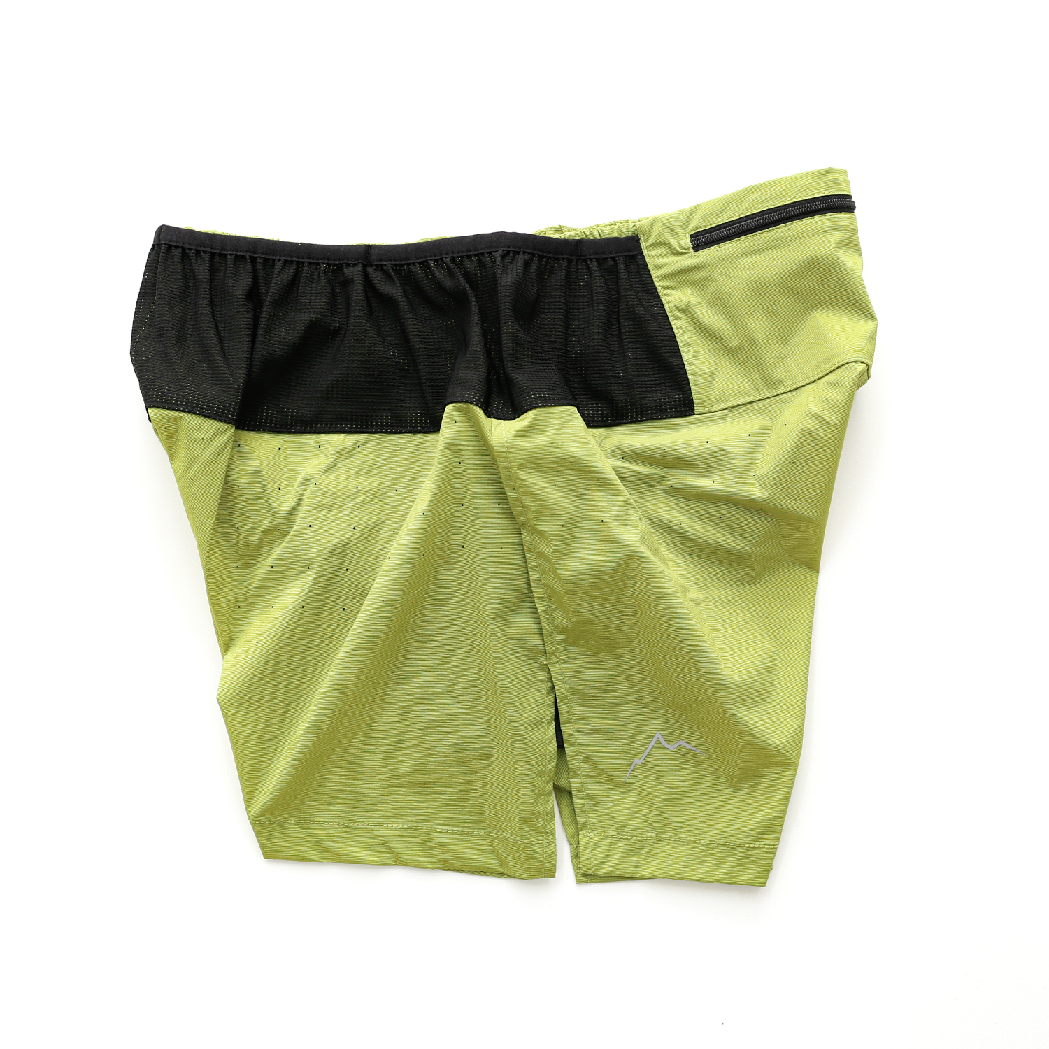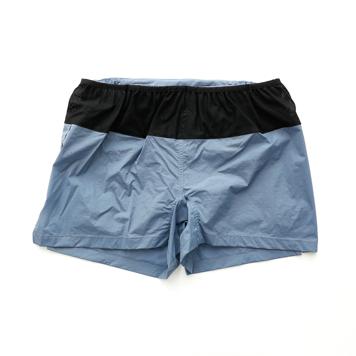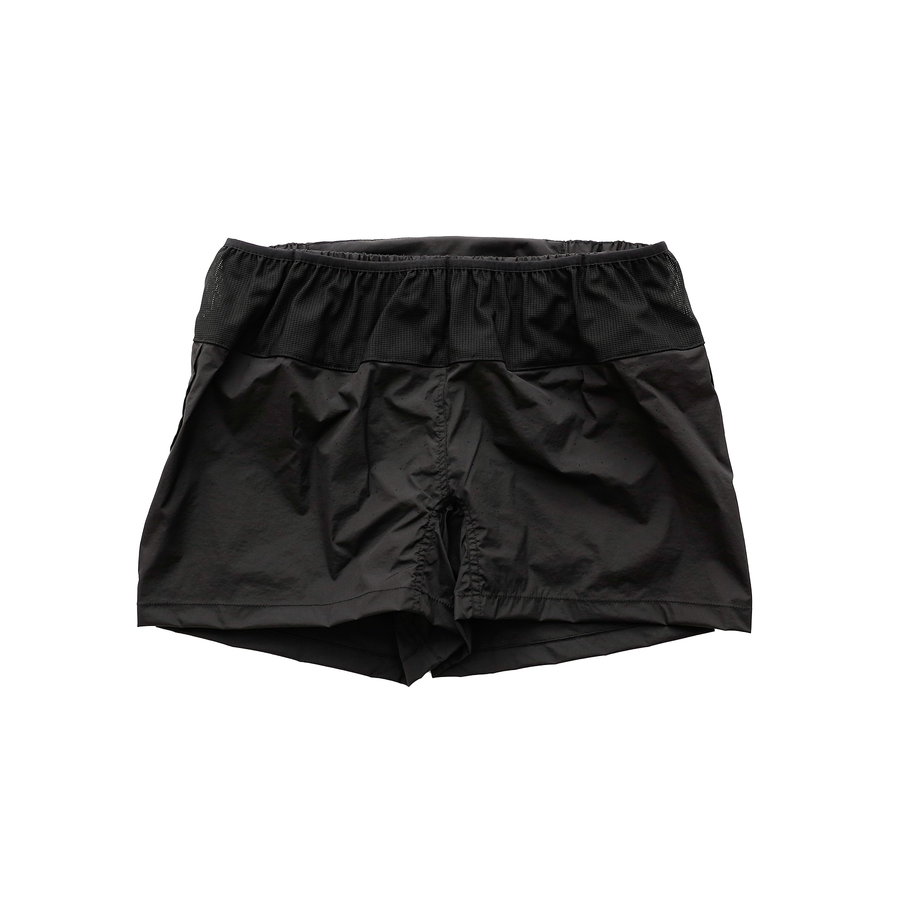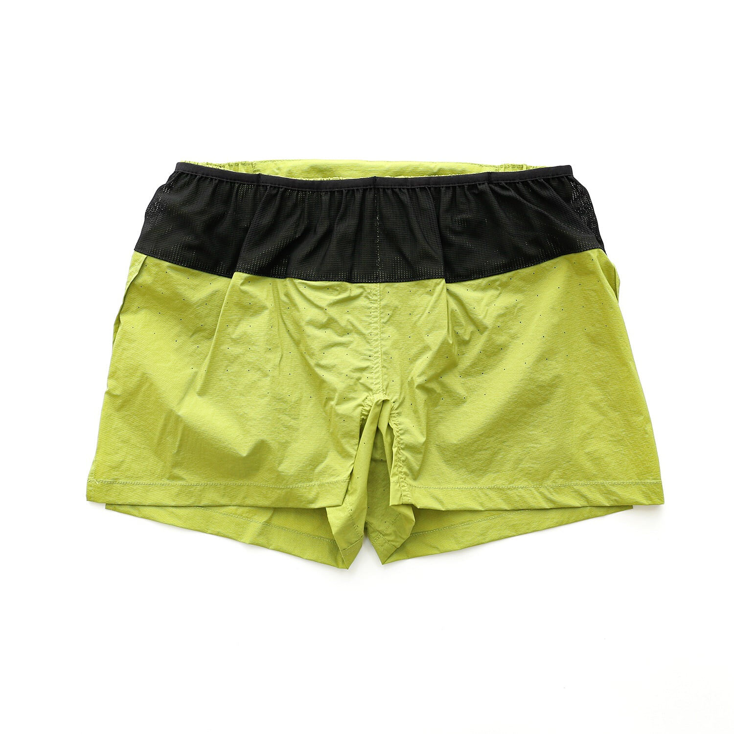 此款跑步短褲使用輕量尼龍彈性布料為基底,表面施加防風與透濕塗層處理,適合夏季戶外運動穿著。