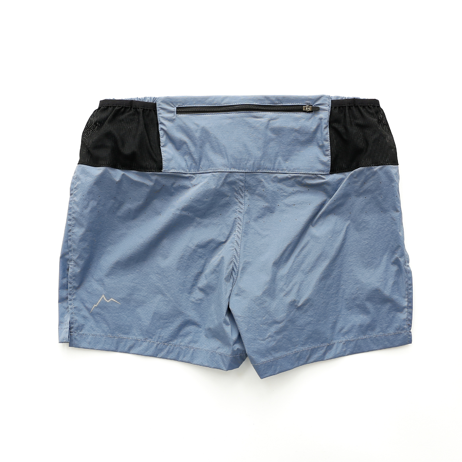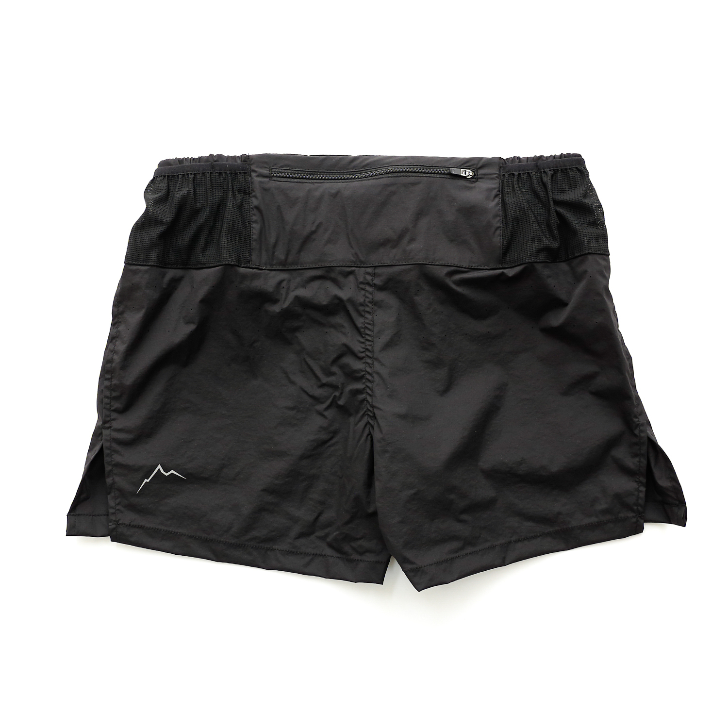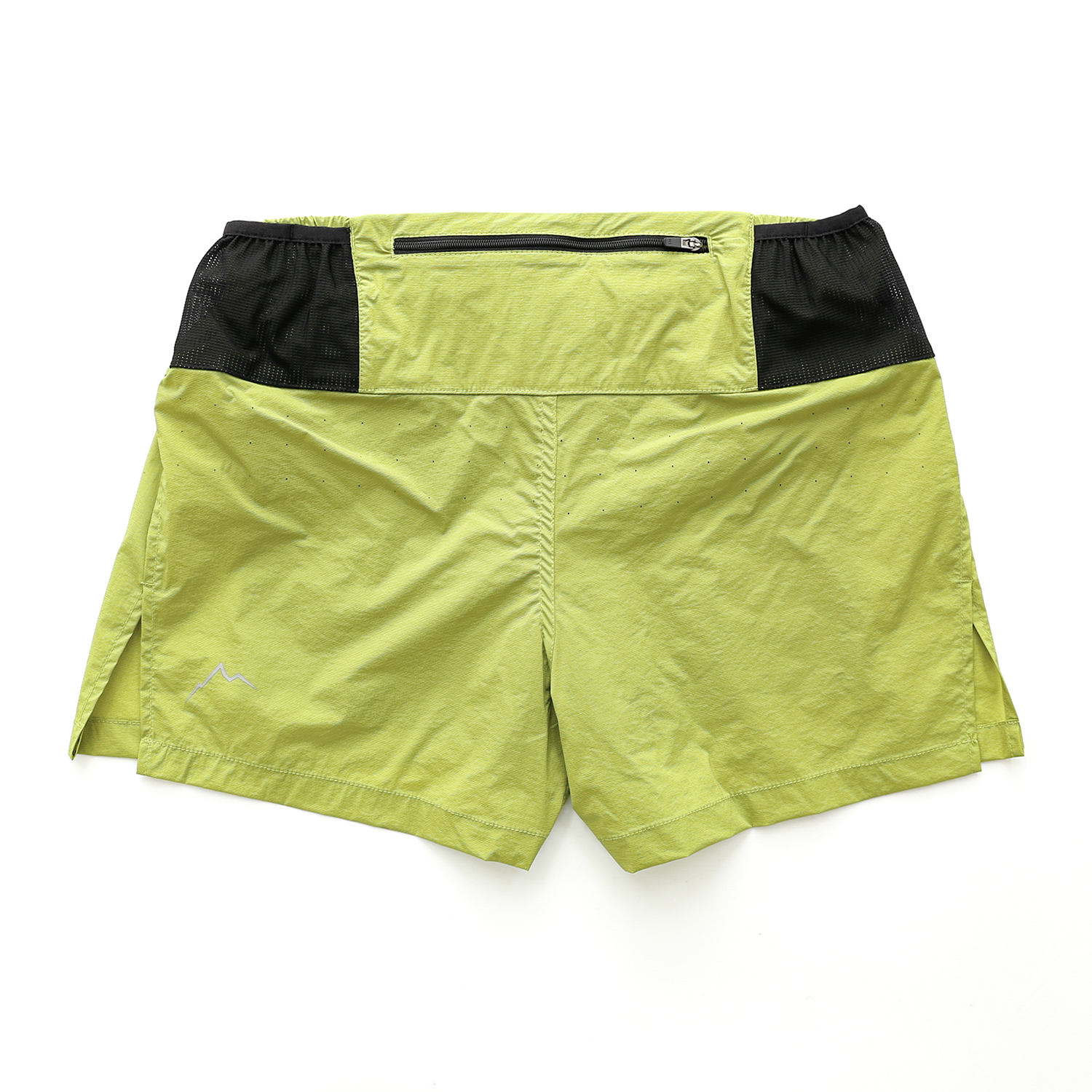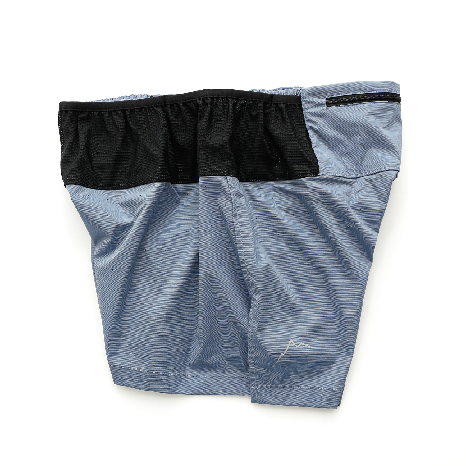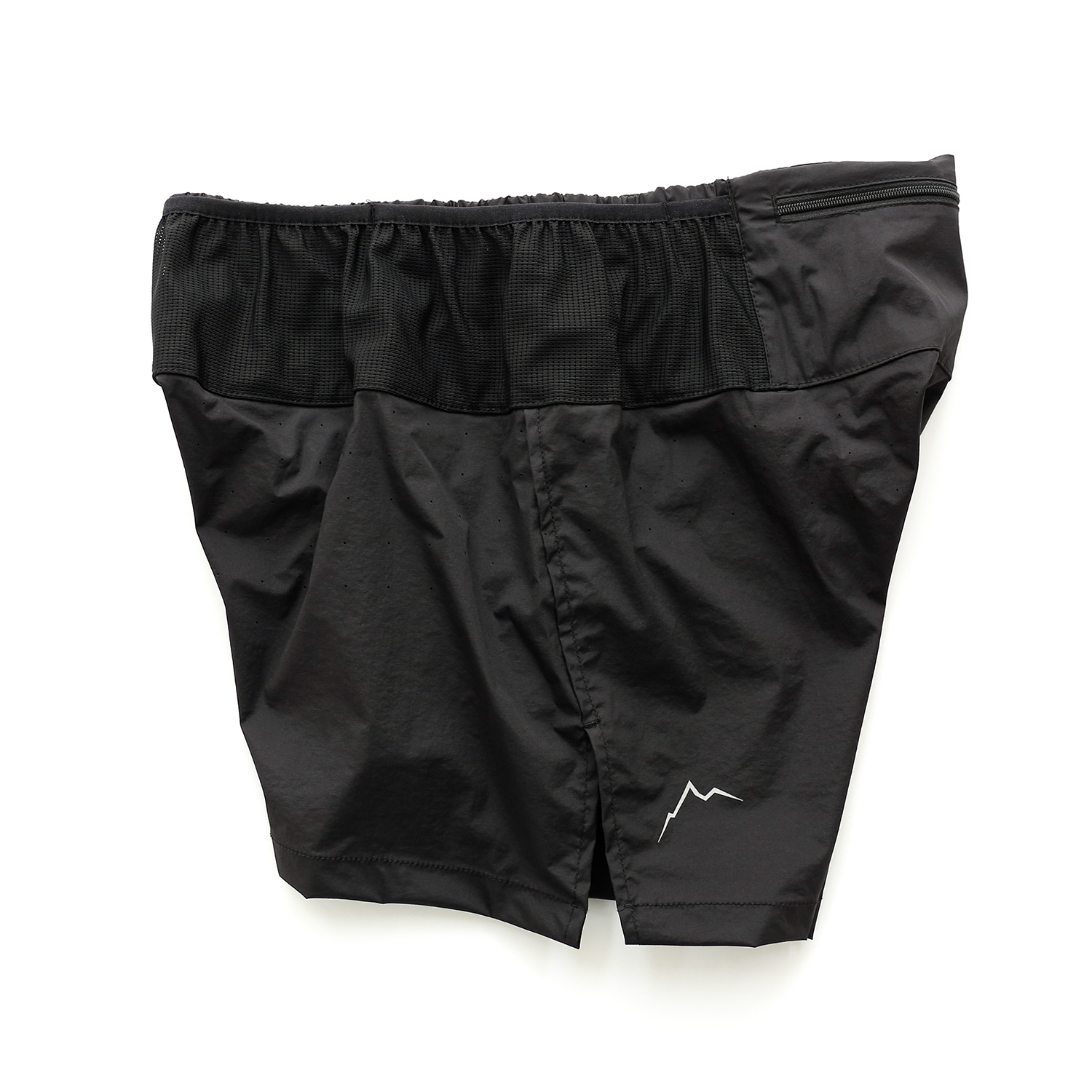 此款跑步短褲使用輕量尼龍彈性布料為基底,表面施加防風與透濕塗層處理,適合夏季戶外運動穿著。