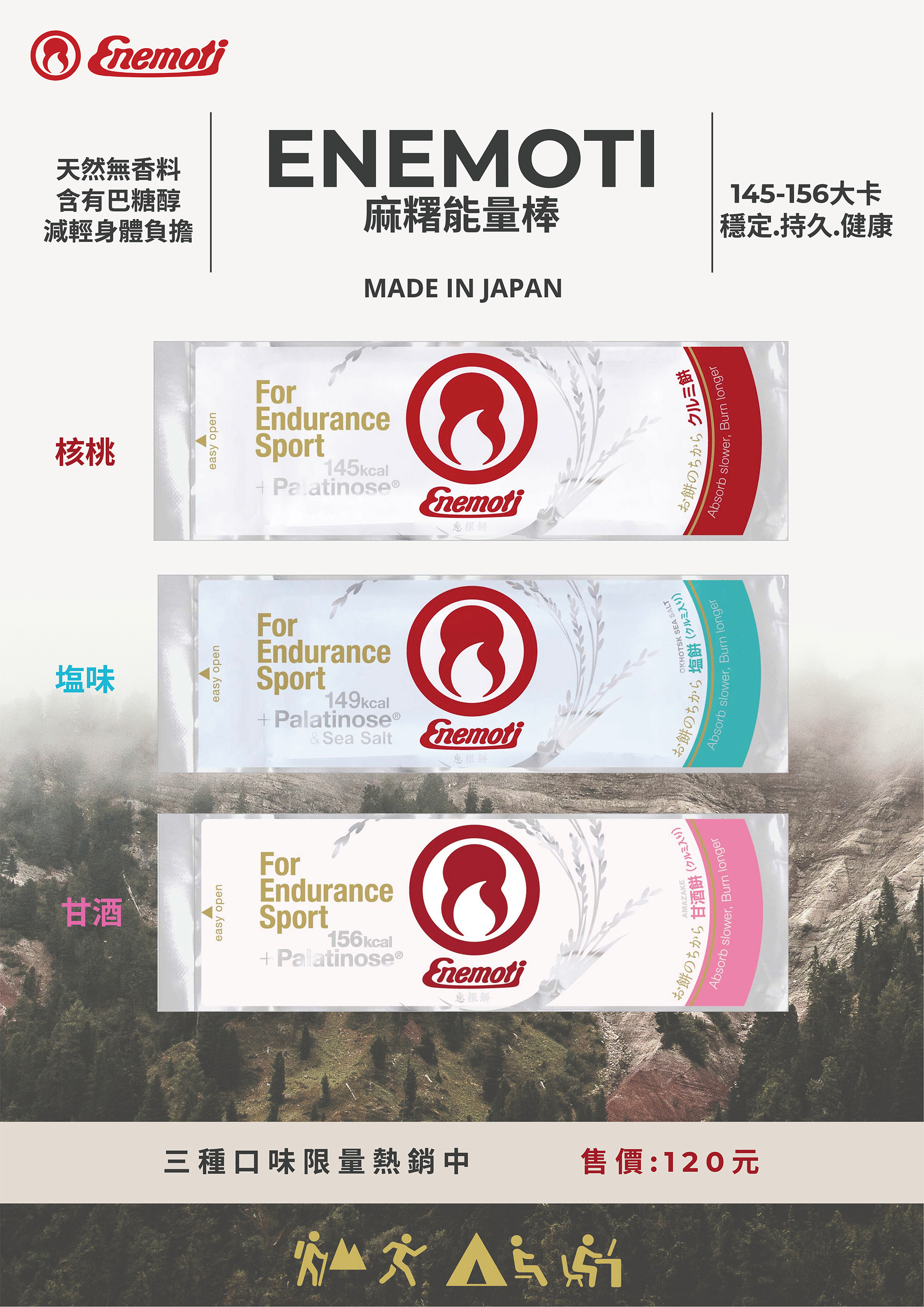 Enemoti 能量惠根餅|來自日本的天然能量補給 Q彈麻糬口感 × 緩釋能量補給 × 和菓子系美味 專為耐力運動設計的能量補給食品,選用天然糙米、蜂蜜與專利天然糖「Palatinose® 巴拉糖」,由日本北海道百年和菓子名店「天狗堂寶船」研發製作,讓補給不只機能,更講究「口感與溫度」。 三種風味任你選擇,無論訓練、比賽或日常補能,都能隨時補給、安心食用。 Enemoti 是一款源自日本的天然能量補給食品,專為耐力運動設計,致力於提供健康、持久的能量支持。 這款產品由日本北海道老字號點心品牌「天狗堂寶船」研發,該品牌擁有多年製作傳統和菓子「黍團子(きびだんご)」的經驗與技術。 Enemoti延續職人精神,選用糙米、蜂蜜等天然食材,並特別添加獲得專利的天然糖「Palatinose®(巴拉糖)」,提供穩定、緩慢釋放的能量來源。 無添加人工香料與色素,強調自然純粹的營養補給,Enemoti 專為馬拉松、自行車、登山等長時間運動打造,是追求耐力與健康表現運動愛好者的理想選擇。 產品特色