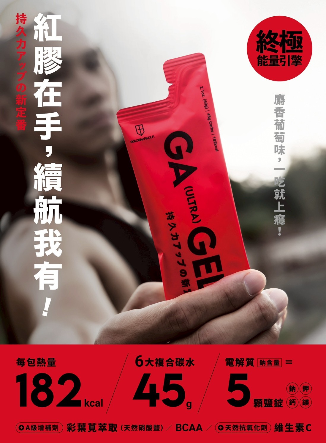 添加天然硝酸鹽(彩葉莧萃取)、牛磺酸、BCAA、黑胡椒精華、維生素C,幫助增強體力耐力,提升整體運動表現。