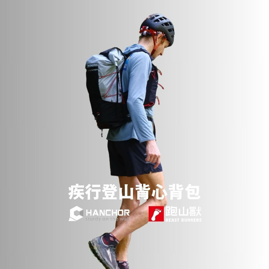 HANCHOR X 跑山獸聯名限定款,越野疾行系列疾行登山背心背包,採用輕量透氣網布材質打造背心式貼身背負感受,提供 14-32L 彈性容量與最即時的補給、飲水,同時給予快速移動的穩定性,完美勝任單日到多天數的登山行程的最佳夥伴。