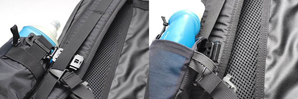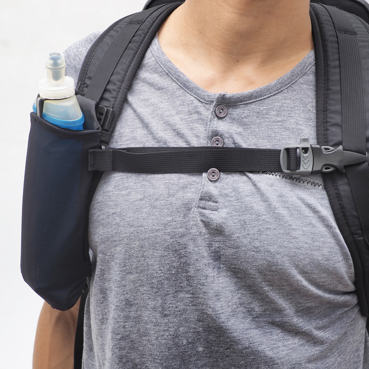 搭配包款肩帶擴充之輕量化肩前水壺袋,拆裝迅速方便,能夠妥善收納軟水壺或一般水瓶 (寶特瓶),提供便利補水機能。