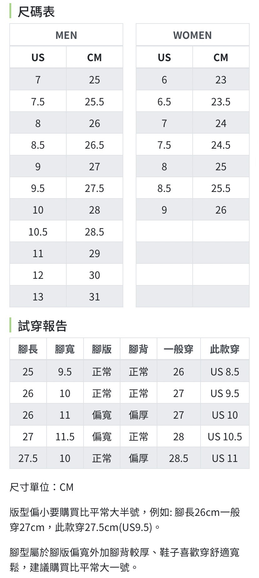 版型偏小要購買比平常大半號,例如: 腳長26cm一般穿27cm,此款穿27.5cm(US9.5)。