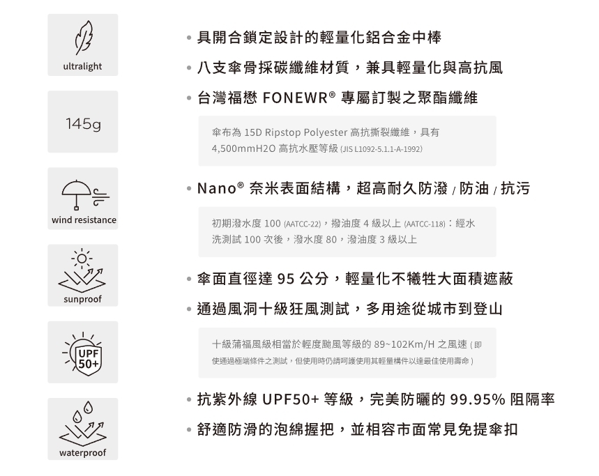 傘骨數量 :8支 傘布 :15D 抗撕裂奈米塗層聚酯纖維 中棒: 鋁合金 傘骨: 碳纖維 |