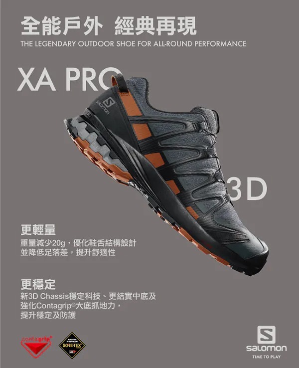 主打穩定性、耐用度和支撐性。XA PRO 3D V9 GORE-TEX是經典鞋款的最新力作 強化了大底的抓地力和鞋款的長效防護性,用途也更多元。 |
