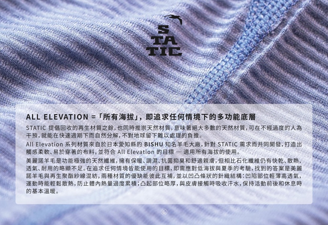 | 產品特色 | .ALL ELEVATION 的意思是「所有海拔」,追求在任何情境下皆能使用的多功能底層衣,一年四季都能舒適地被穿著,即使在夏天也能享受功能性極強的羊毛。 .採用美麗諾羊毛與再生聚酯纖維的混紡,善用兩種材質的優缺,達到彼此互補,以凹凸條狀的針織結構:凹陷部位輕薄高透氣,運動時能輕鬆散熱,防止體內熱量過度累積;凸起部位略厚,與皮膚接觸時吸收汗水,保持活動前後和休息時的基本溫暖。 .以無氯、無樹脂的羊毛加工處理,來防止鱗片相互纏繞的收縮發生,最大限度保留羊毛良好的原始特性,並對工廠人員更加安全健康,廢水也更能被生物降解的環境友善。 .採用再生聚酯纖維,以減少生產過程中的二氧化碳排放,並將製造過程中產生的剪裁廢料回收再利用。 .後背長度加長版型,防止彎腰時露出背部。 .下擺具有友善女性腰臀比的開衩設計。 .整體採用平縫工法,皮膚接觸更加舒適。 .美麗諾羊毛來自澳洲或紐西蘭,並通過友善羊毛之認證。 .洗標與品牌標籤均以再生聚酯纖維和棉花製成。 .可手洗,或機洗(放入洗衣網袋,並採用柔洗/精緻流程) 。 .請勿使用漂白劑、柔軟劑,並勿烘乾或乾洗。 |