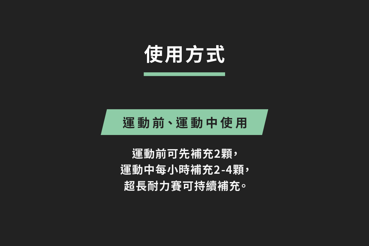 ▲食用方式:運動前補充2顆,運動中每小時或大量流汗可每次補充2-4顆