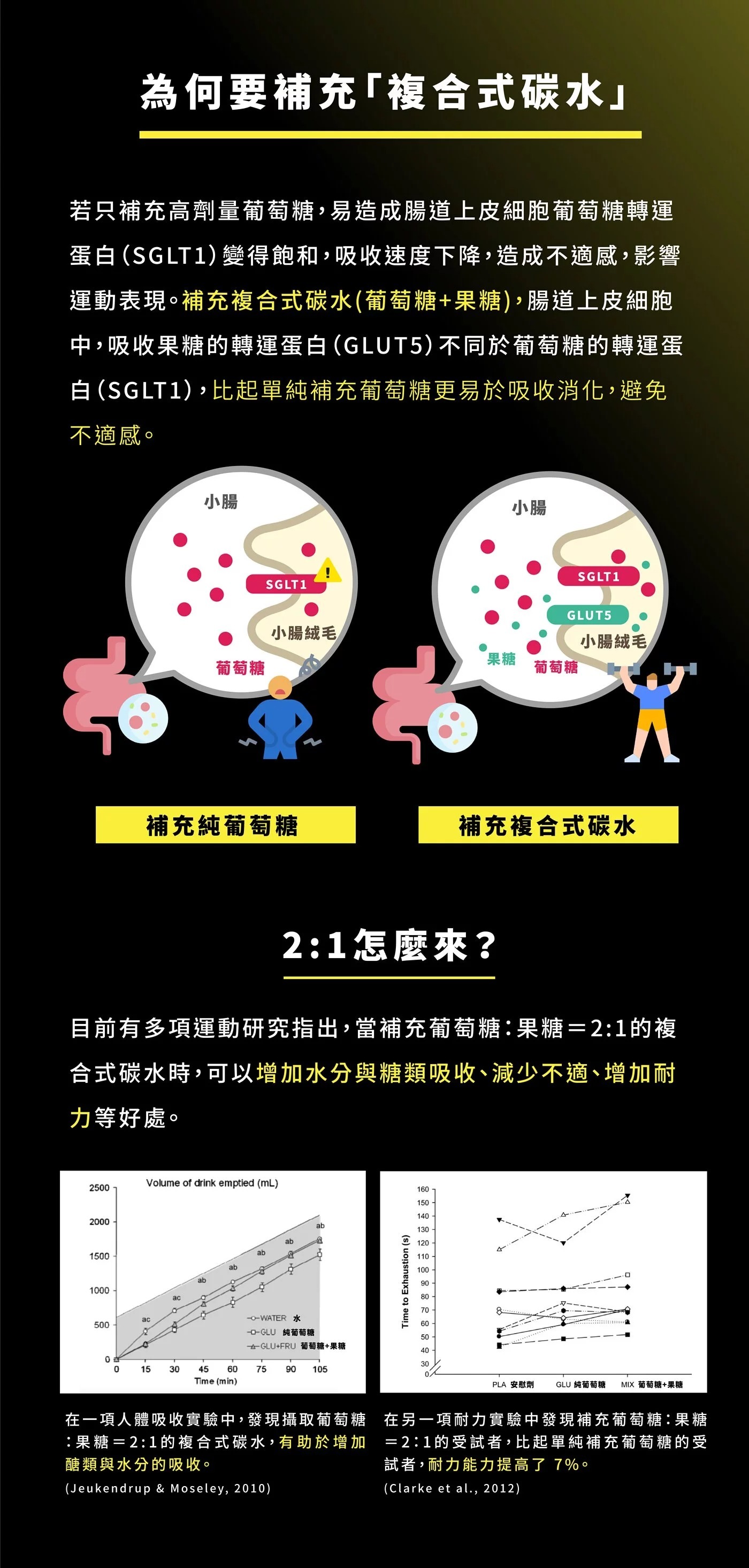 使用葡萄糖:果糖=2:1複合碳水配方,經科學文獻證實可加速吸收,降低腸胃負擔 ,全素可食用
