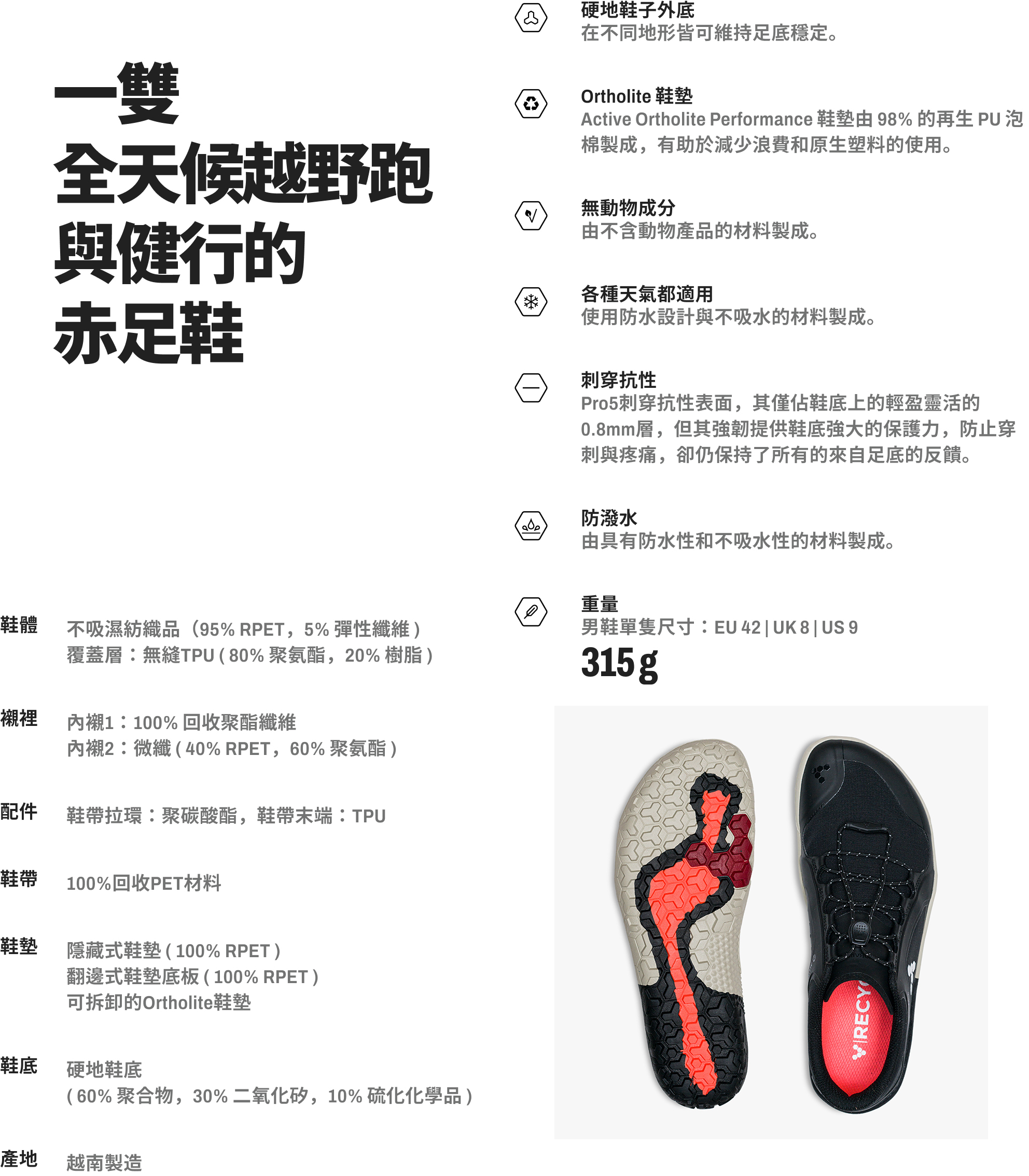 鞋體:不吸濕紡織品(95% RPET,5%彈性纖維)覆蓋層:無縫TPU80%聚氨酯,20%樹脂)