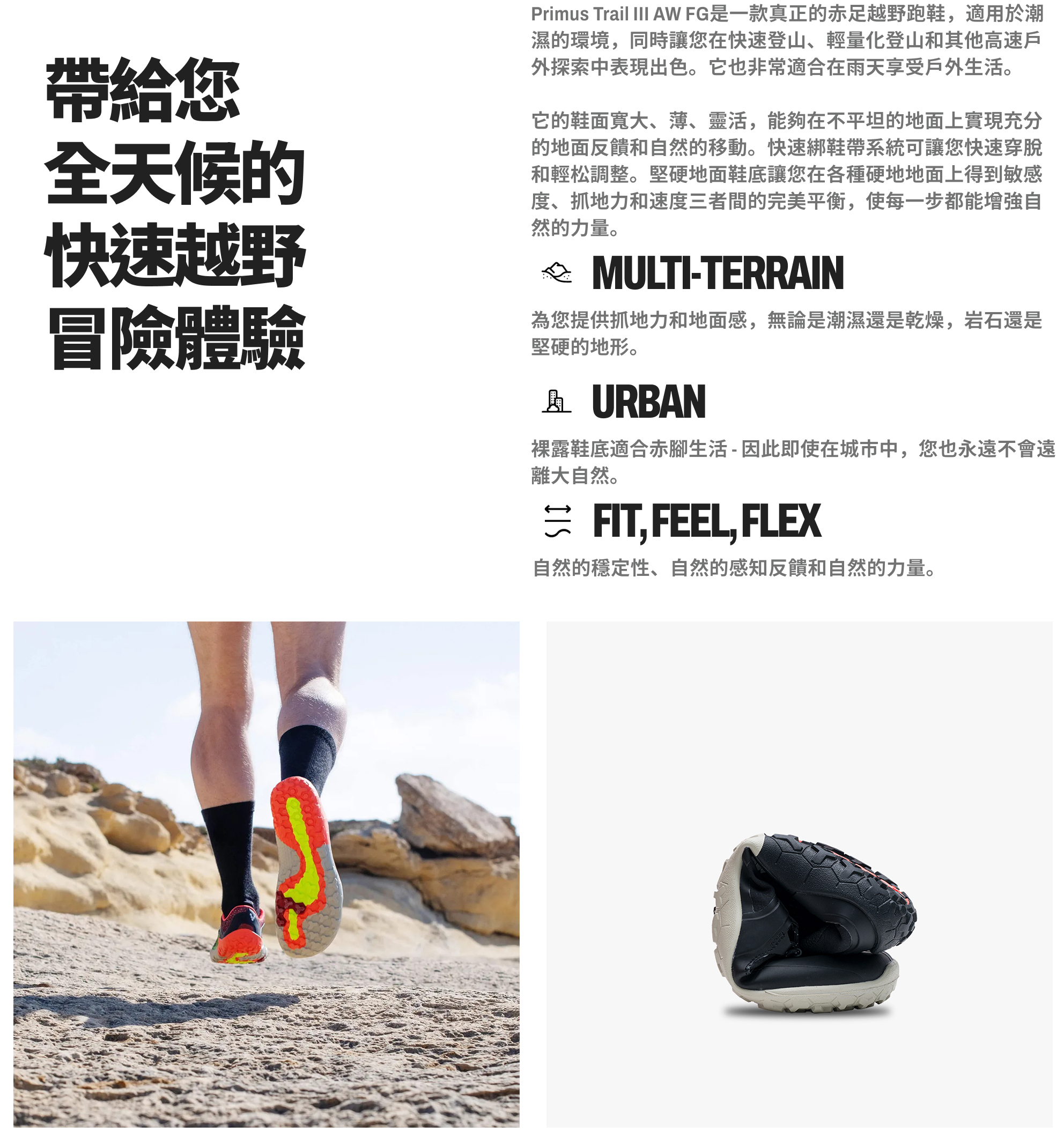 同樣輕巧、耐用與靈活,適用於各種硬地小徑探險。其所有材料都使用回收的或是無動物成分的高性能材料製成。 另外其採用了防水設計,更適用於在潮濕和較冷的地區從事越野跑或者健行等活動。
