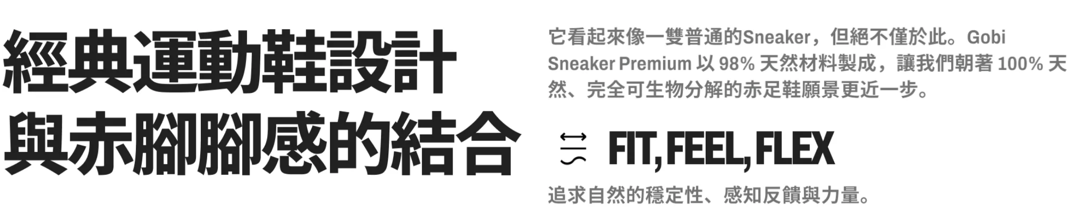 這是我們最貼近自然的設計,以 98% 天然材料製成,並與 NFW 合作打造 100% 天然大底。經典的運動鞋輪廓、創新的材質與赤足貼合的體驗,Gobi Sneaker Premium 重新定義了順應自然本能的行走方式。