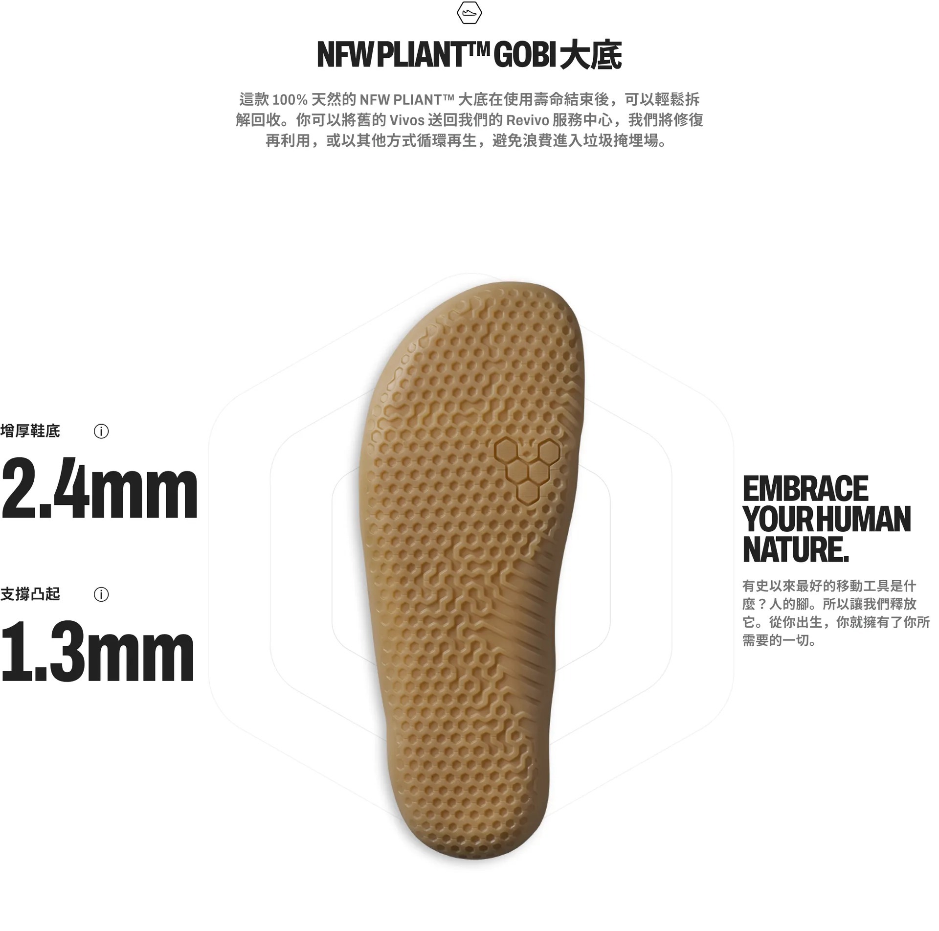 NFW PLIANT™ GOBI OUTSOLE 盡可能的貼近地面 軟木與再生PU鞋墊 Everyday Cork & Recycled PU 鞋墊由再生PU製成,頂部覆蓋一層天然抗菌軟木。 皮革鞋墊 脫下襪子,享受純粹的赤足感受。 |