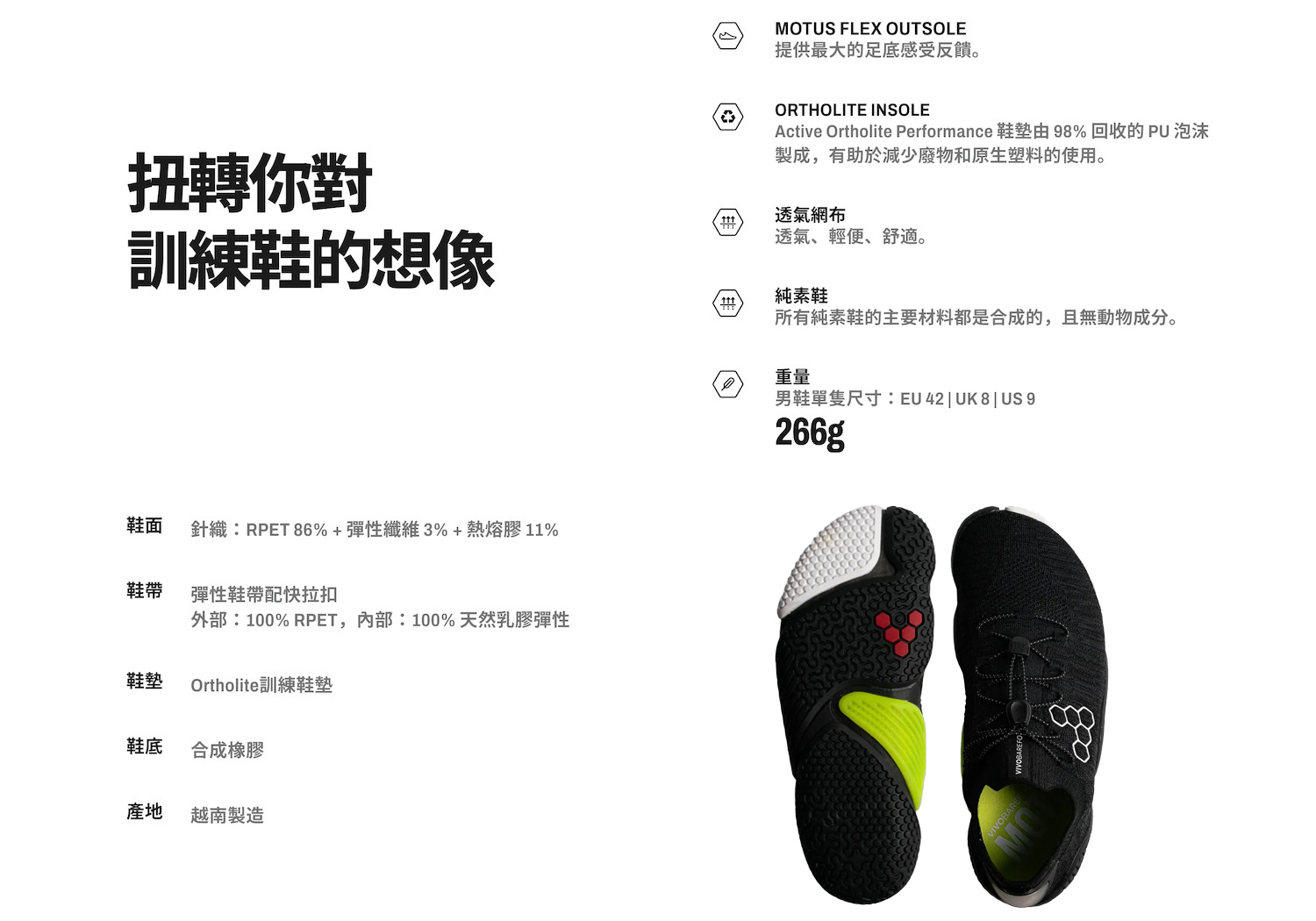 | 商品特色 | Motus Flex 採用一體成型的針織襪套鞋面和薄且分離的外底。 這是我們最靈活的赤足鞋底。超輕量的 Motus Flex 設計讓您的雙腳能夠在各個方向上自由移動和彎曲。 旨在提供健身操、各種動作流、徒手訓練等提供無與倫比的赤腳感和靈活性。即便不是赤腳,也能感受到如同赤腳般的感覺,體驗每一絲細微的足底反饋。 |