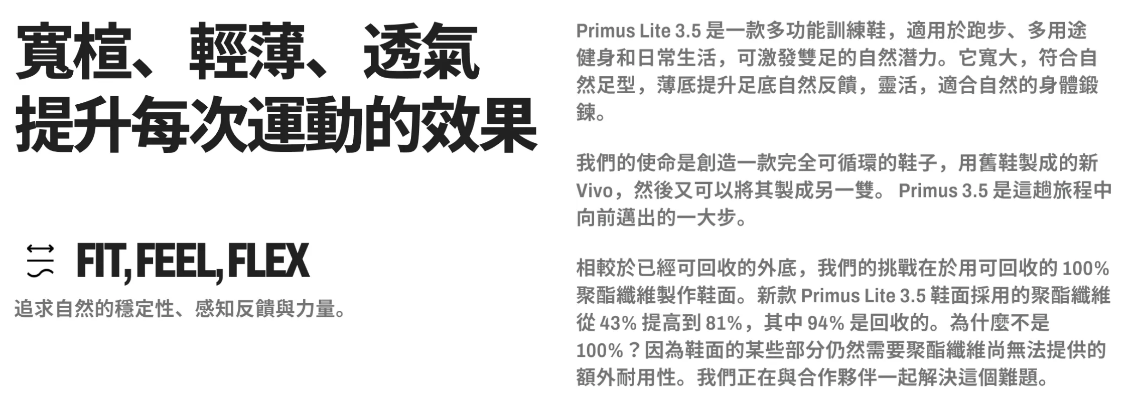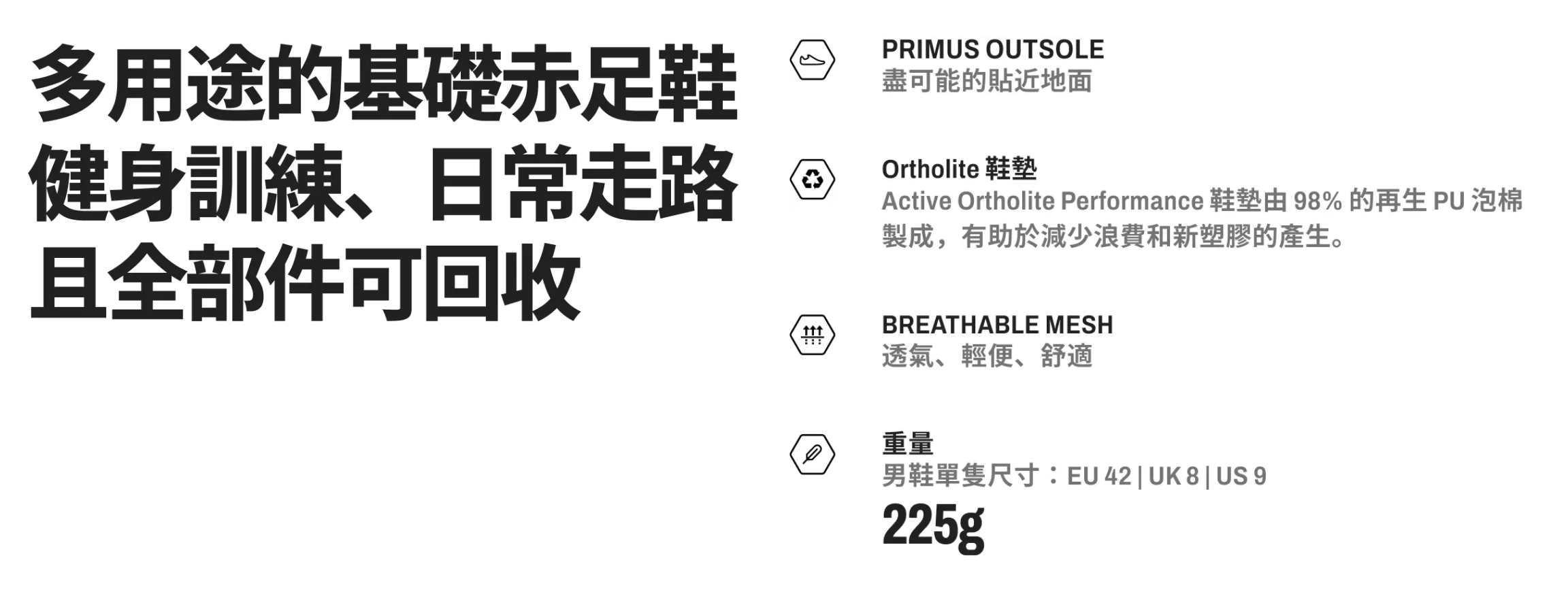 | 商品特色 | Primus Lite 3.5 是Vivo原創的全能訓練鞋,經過多次優化,採用了新的鞋面,讓材料更具循環性。它專為在跑步和廣泛的各種訓練過程中,增強自然動作和增強自然力量而設計,非常適合經驗豐富的赤足混合健身者和赤足訓練新手。 它也適合經驗豐富的赤腳跑步者,或者適合新手跑步者的輕度路跑。 |