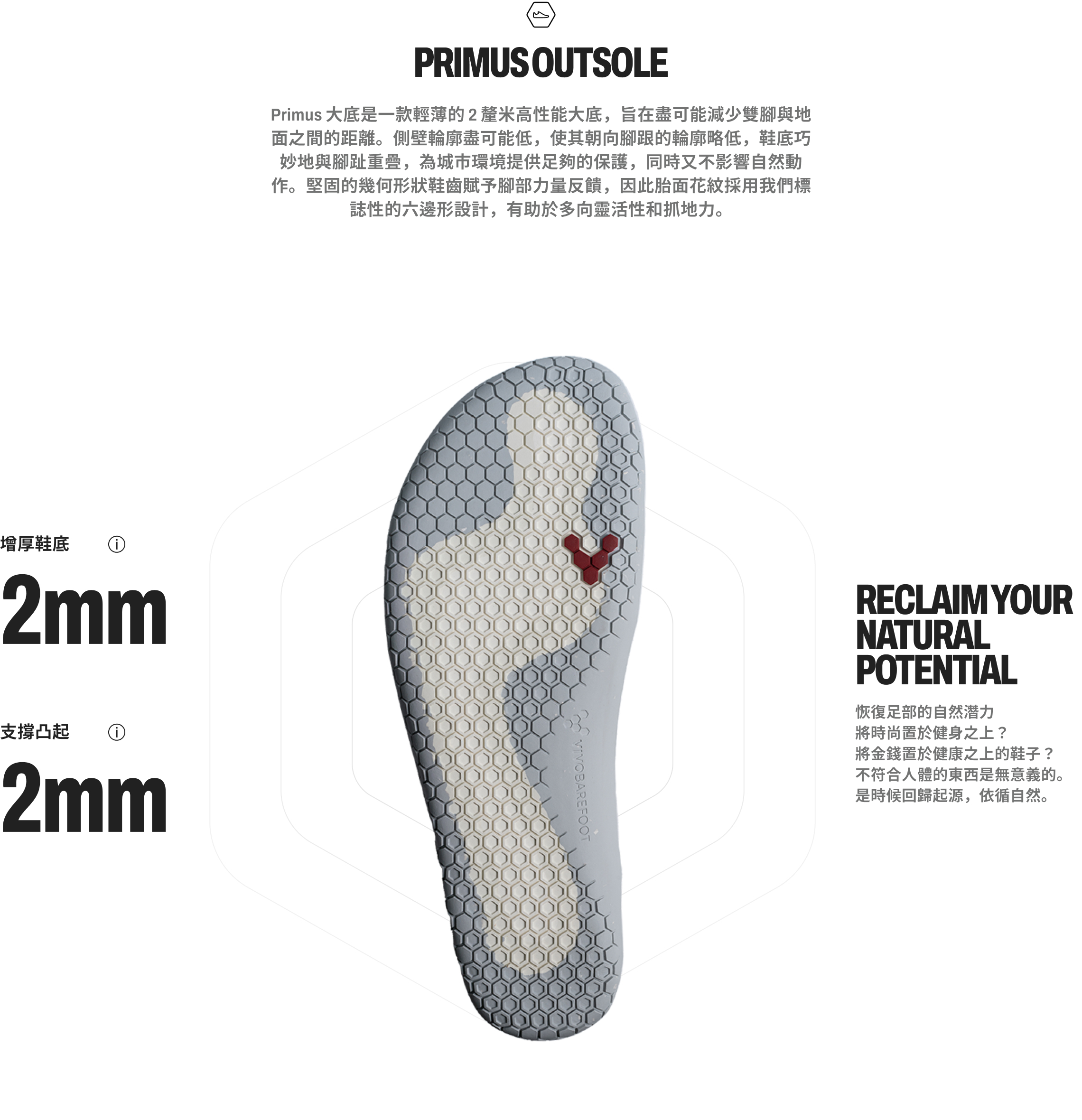 Primus Lite 3.5 是Vivo原創的全能訓練鞋,經過多次優化,採用了新的鞋面,讓材料更具循環性。它專為在跑步和廣泛的各種訓練過程中,增強自然動作和增強自然力量而設計,非常適合經驗豐富的赤足混合健身者和赤足訓練新手。
