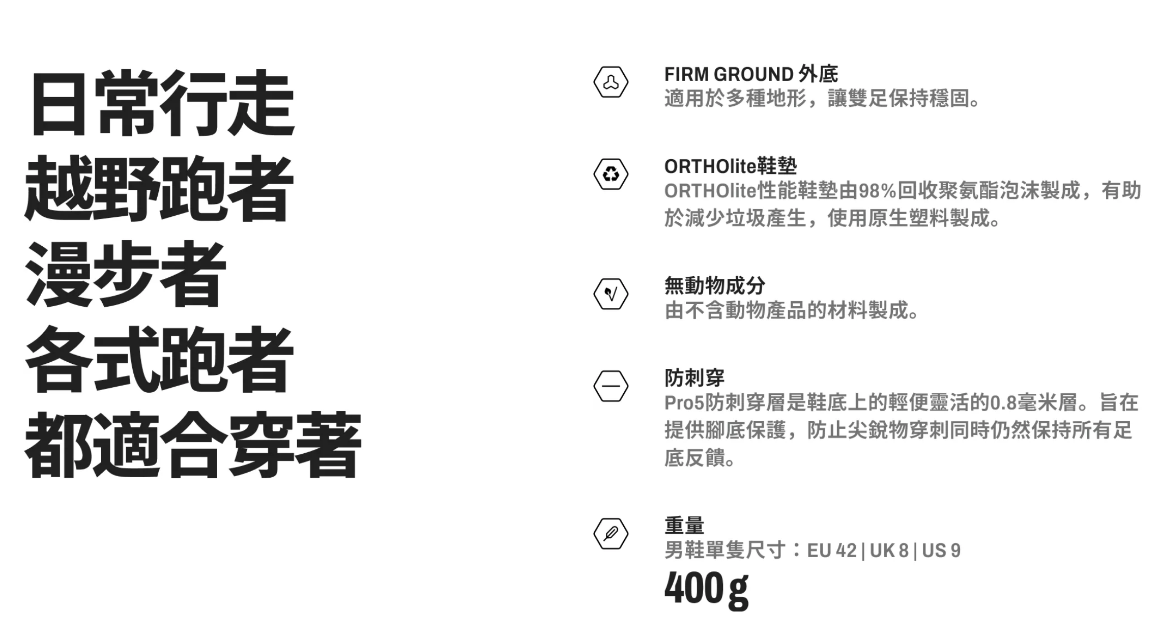 採用針織鞋面,提供卓越的透氣性和更純粹的越野靈活性,使用極高等級回收材料製成,並具有襪套設計,防止越野小徑上的碎石進入,並抓緊腳踝。
